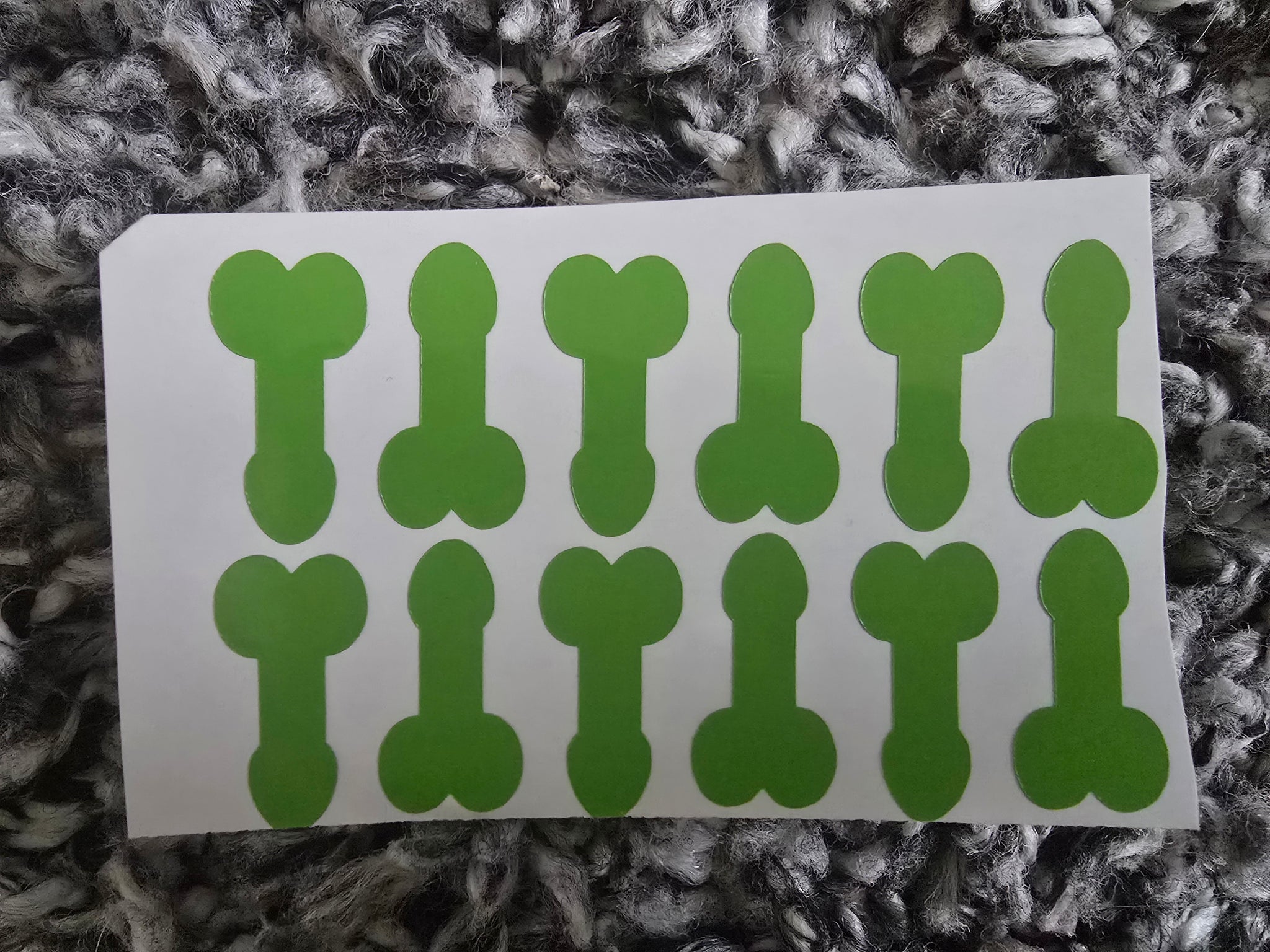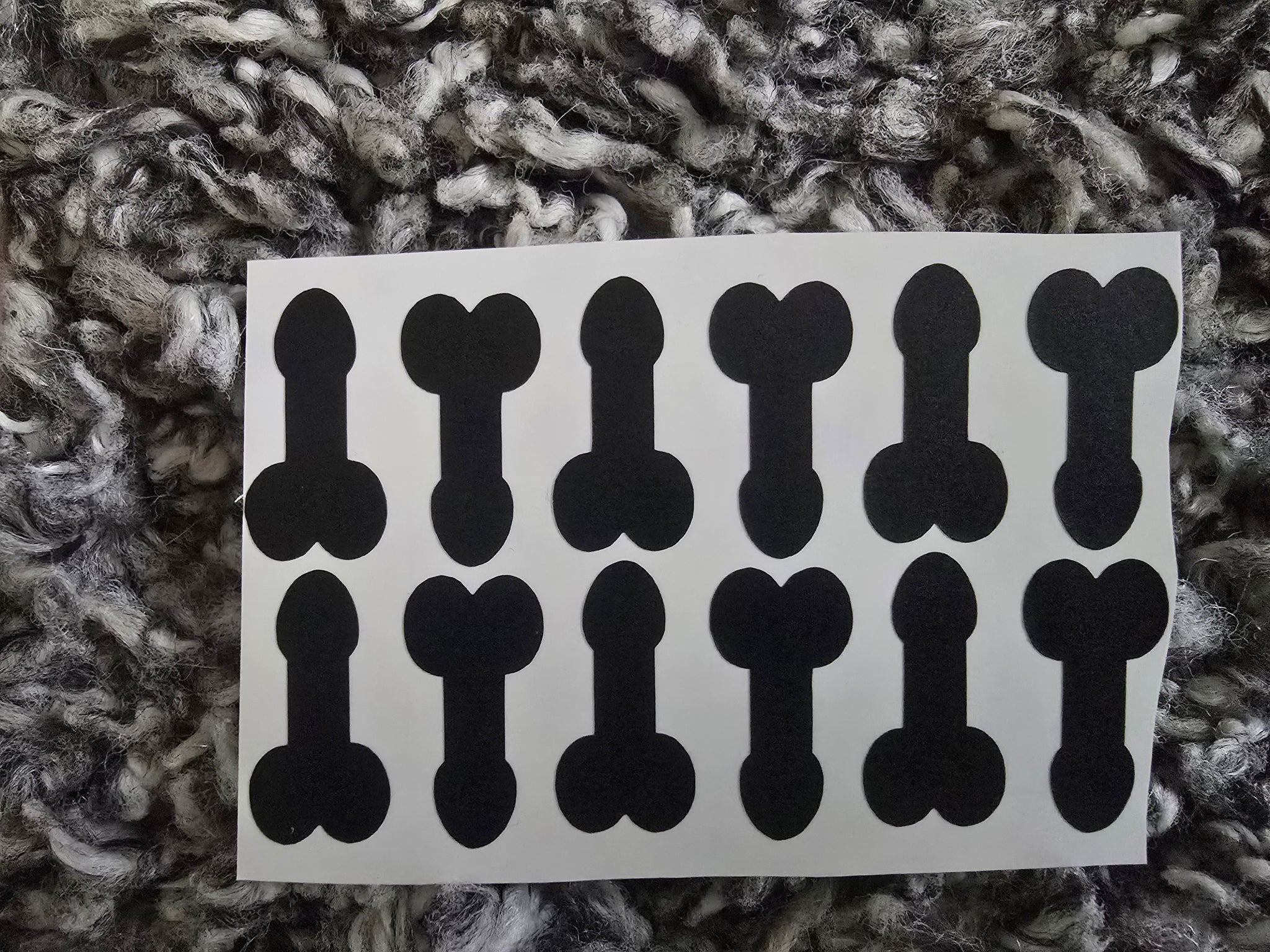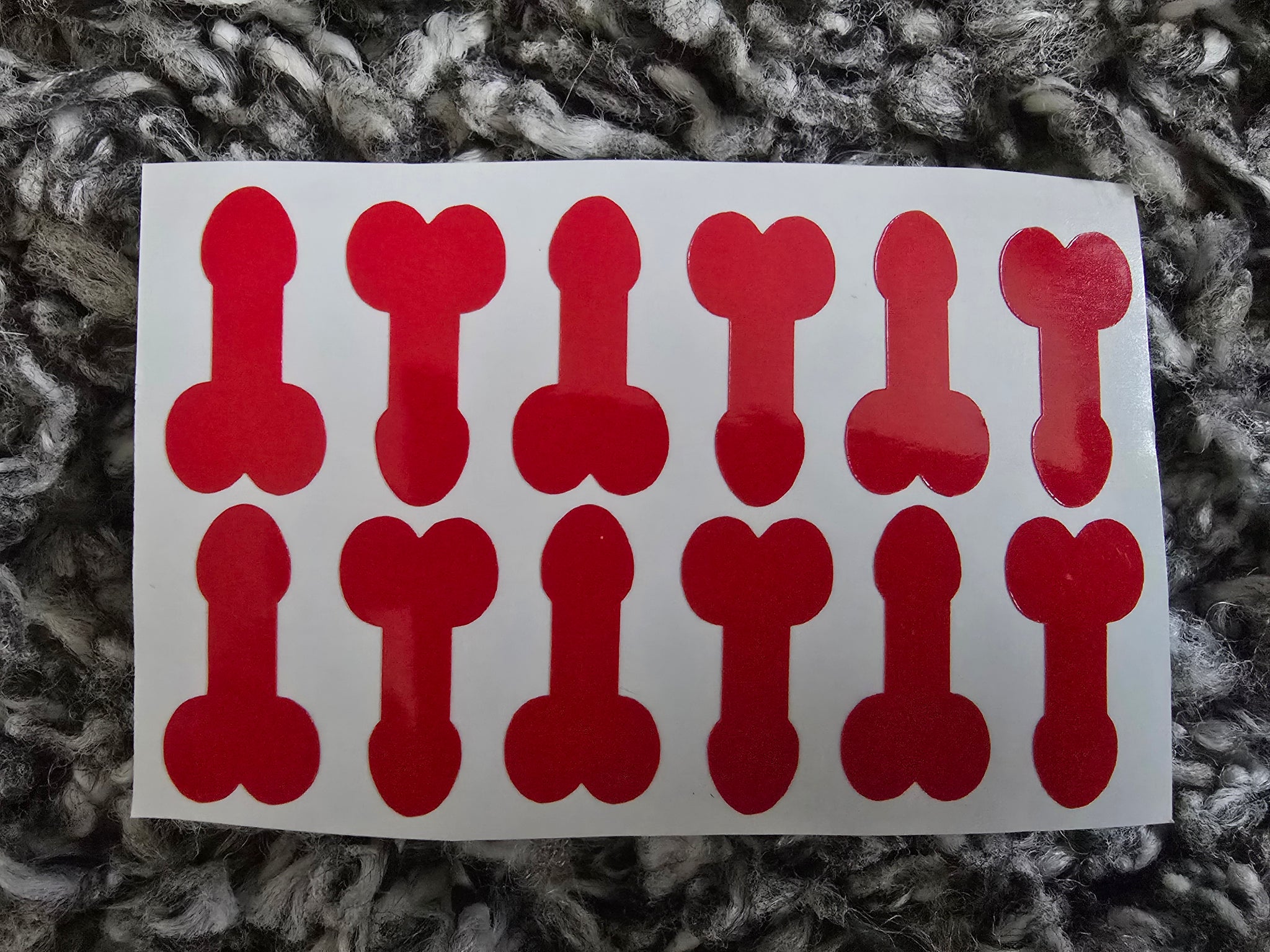 Set of 12 1 inch Dick Stickers. Great fun to quickly peel and stick everywhere you go.